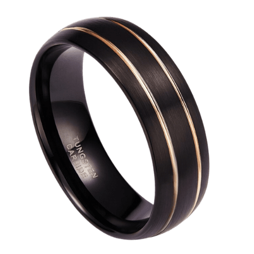 Ein atemberaubender mattschwarzer Wolframring für ihn mit einer majestätischen doppelten Goldrille. Ein markanter und unglaublich eleganter Herrenring mit sanft gewölbter Form.