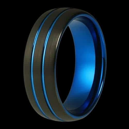 Atemberaubend und einzigartig, dieser Ring wird garantiert auffallen. Ein wunderschöner, kuppelförmiger schwarzer Wolframring für Herren mit zwei Rillen in leuchtendem Blau und einer blauen Innenseite. Großartig!