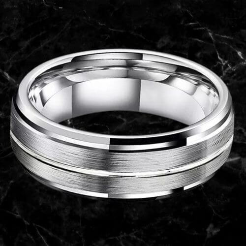 Ein einzigartiger silberner Wolframring, der wirklich elegant aussieht. Ein glänzender Silberring für ihn mit zwei erhabenen Abschnitten aus gebürstetem Silber. Eine fesselnde Variante eines traditionelleren Ringdesigns.