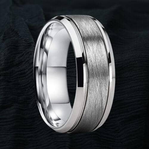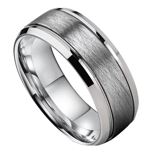 Majestätischer Wolframring für Herren mit einem atemberaubenden gebürsteten Finish in der Mitte und Rillen auf beiden Seiten. Ergänzt durch elegante abgeschrägte Kanten. Eine wunderbare Wahl für einen auffälligen Ehering oder Verlobungsring für Herren.