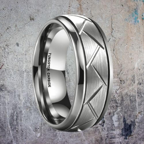 Ein auffälliger Ring für Männer, perfekt, wenn Sie etwas Außergewöhnliches suchen. Dieser Wolframring hat eine gebürstete Silbermitte mit markanten Rillen. Ein rundum großartiger Männerring.