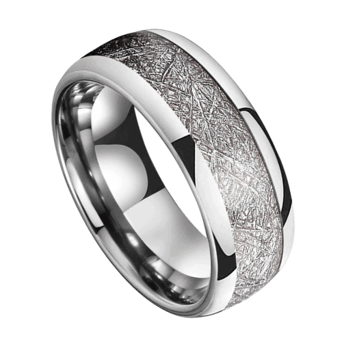 Ein atemberaubender silberner Wolframring für ihn mit einer Einlage aus bezauberndem künstlichem Meteoriten. Auffallend und beeindruckend, das ist ein großartiger Herrenring.