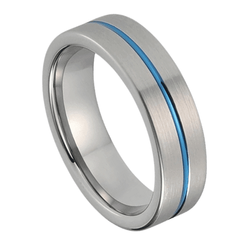 Ein atemberaubendes Ringdesign für Männer. Ein flacher Wolframring mit gebürstetem Silberfinish und einer blauen Mittelrille. Das Höchstmaß an Stil und Eleganz mit einem neuen und erfrischenden Ring für ihn.