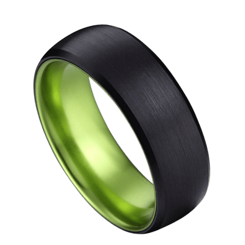 Die leuchtend grüne Innenseite des Verdurous-Rings für ihn ist mutig und erfrischend. Kuppelförmiger Wolfram-Herrenring mit gebürsteter, mattschwarzer Oberfläche. Einfach erhaben.