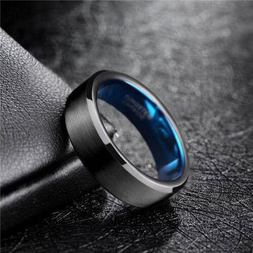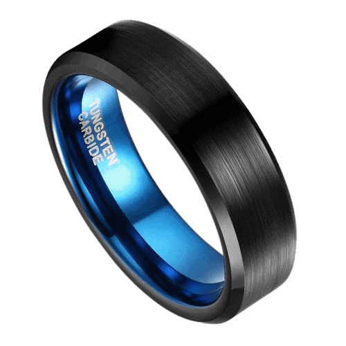 Ein stilvoller und anmutiger schwarzer Ring für Männer aus Wolframkarbid. Der prächtige Versiert-Ring ist robust und langlebig und weist eine ausgezeichnete Kratzfestigkeit auf. Die Mitte des Rings ist schwarz gebürstet mit kontrastierenden polierten schwarzen abgeschrägten Kanten. Um Ihrem Ring eine persönliche Note zu verleihen, ist die Innenseite des Rings in einem leuchtenden, polierten Blau gehalten.